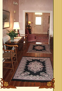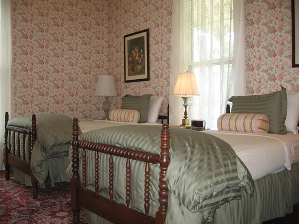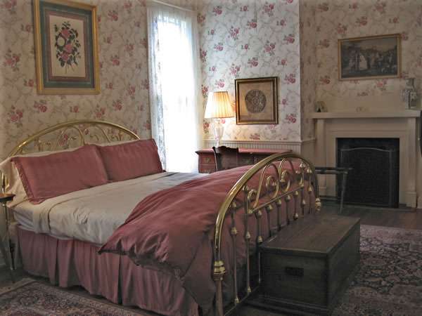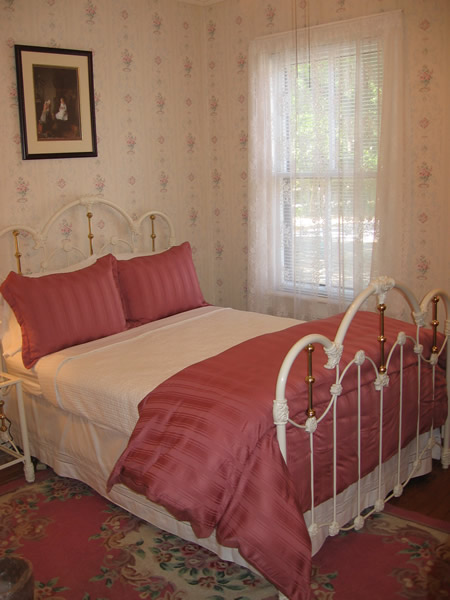 Our smallest room is perfect for a quick getaway or one person traveling alone. It has a double bed with antique wrought iron frame, light floral wall covering, antique dresser and a comfortable chair.