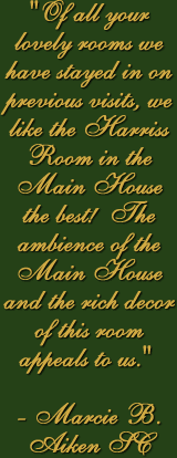 This very private room is on the second floor of the main house and overlooks the front lawn. It is draped in rich greens, browns and has dark wood furniture. It features original plank wood flooring, fireplace with ornamental mantel, a ceiling fan, a queen-sized bed with heavy wood frame and two easy chairs. The bathroom is spacious with tub and shower.